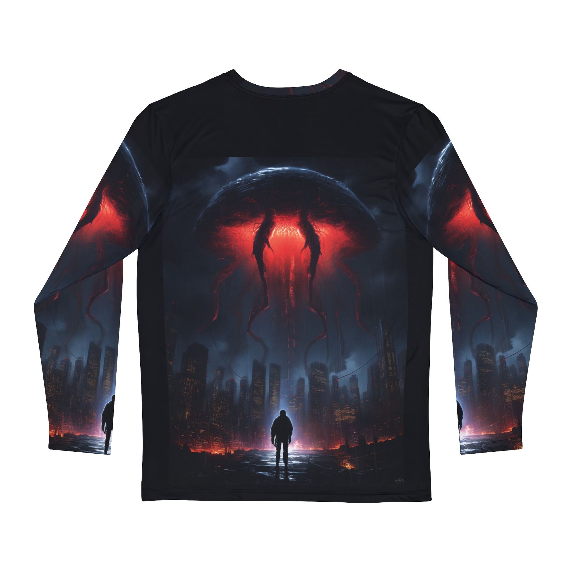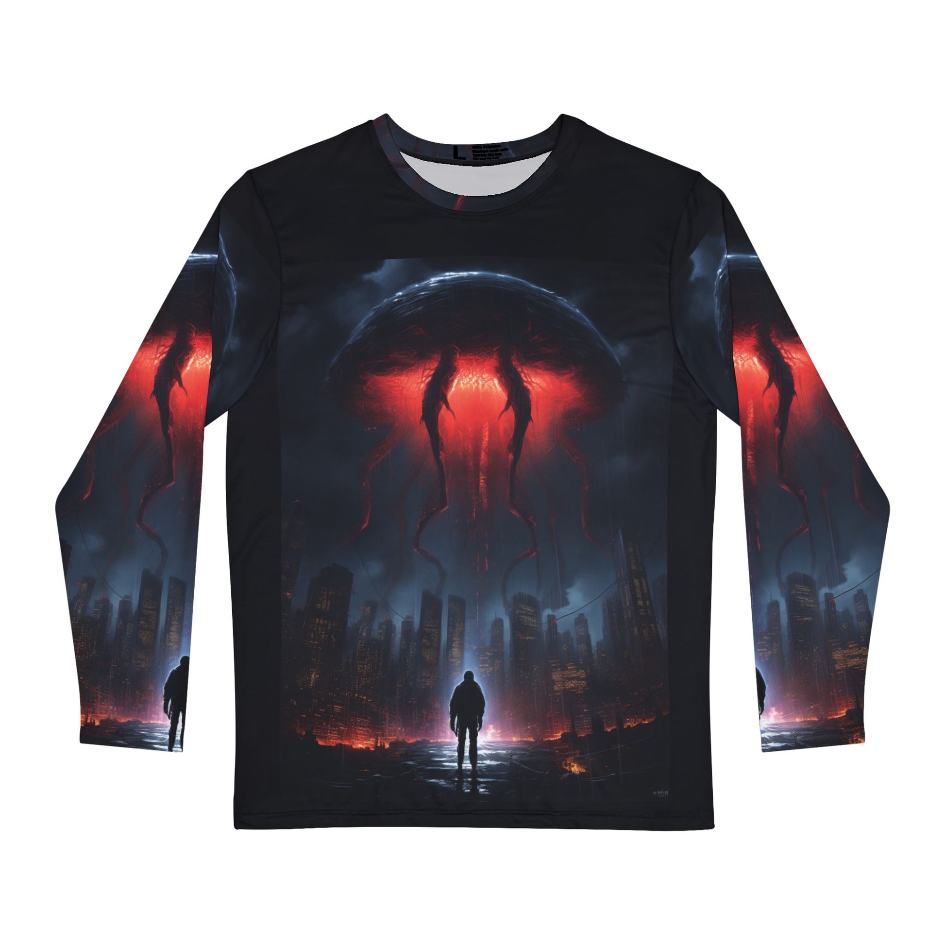 A striking all-over print long sleeve that captures a cinematic, post-apocalyptic moment. Dark city silhouettes glow with ember-red light beneath a colossal, otherworldly presence filling the sky. The lone figure standing in the foreground draws you into a story of quiet defiance and wonder — a piece that reads like a scene from a midnight sci-fi epic. Lightweight and quick-drying, the shirt keeps the artwork vivid across the front, back and sleeves so the scene feels continuous and immersive. Wear it when you want your look to tell a narrative: late-night creative sessions, convention nights, or when you’re out exploring the city and want to channel that moody, speculative vibe.