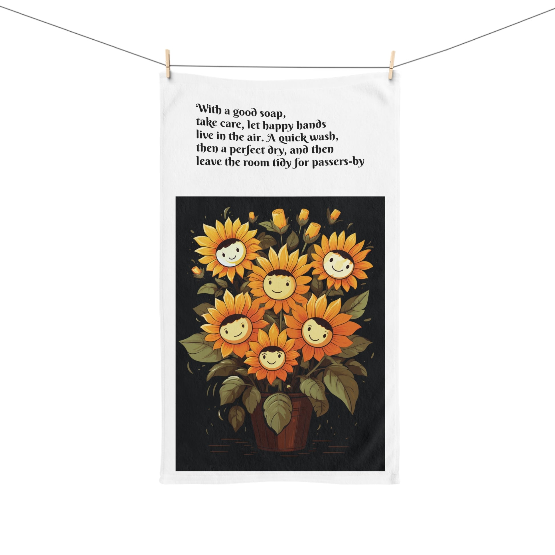 Brighten up your home with this cheerful hand towel featuring a delightful sunflower design. Its vibrant colors and soft texture create a warm and inviting atmosphere, perfect for any kitchen or bathroom. Ideal for those who appreciate a touch of fun in their home decor, this towel is perfect for everyday use as well as special occasions. Whether you're celebrating a birthday, hosting a garden party, or simply want to add a splash of happiness to your space, this hand towel is a great choice. It makes for a thoughtful gift for friends and family who love unique home accessories, especially during holidays like Mother's Day or summer celebrations. Product features - Super soft and lightweight for ultimate comfort - Vibrant colors created using advanced printing techniques - Highly absorbent material for efficient liquid absorption - Durable blend of 52% polyester and 48% cotton that retains shape - One size (16" × 28") fits perfectly in any space Care instructions - Machine wash separately: cold (max 30C or 90F), gentle cycle - Do not bleach - Tumble dry: low heat - Do not iron - Do not dryclean